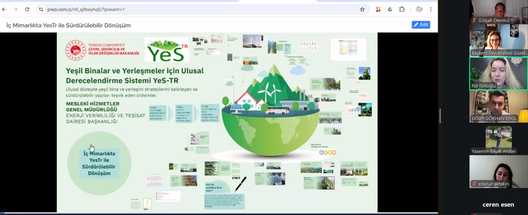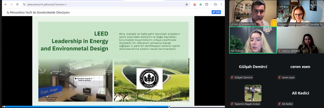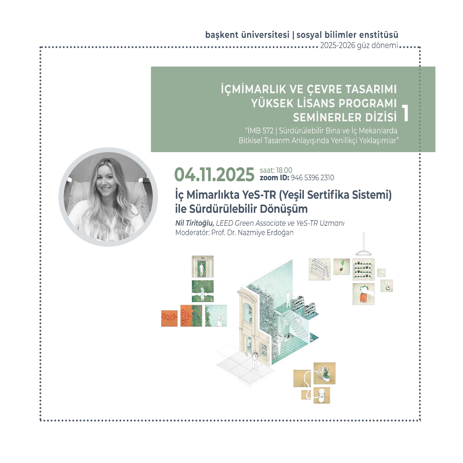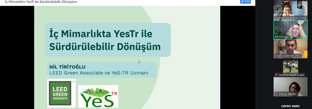 İç mekânlarda sürdürülebilir dönüşüm, geleceğin tasarım anlayışını bugüne taşıyor. Başkent Üniversitesi İç Mimarlık ve Çevre Tasarımı Yüksek Lisans Seminer Serisi kapsamında “İç Mimarlıkta YeS-TR (Yeşil Sertifika Sistemi) ile Sürdürülebilir Dönüşüm” oturumunda, Konuğumuz Nil Tiritoğlu hem YeS-TR sisteminin yerel yaklaşımını hem de LEED sertifikasyonunun uluslararası kriterlerini anlattı. Yeşil sertifikaların yalnızca yapı ölçeğinde değil, iç mekân tasarımında da çevresel, sosyal ve ekonomik fark yarattığını vurguladık.