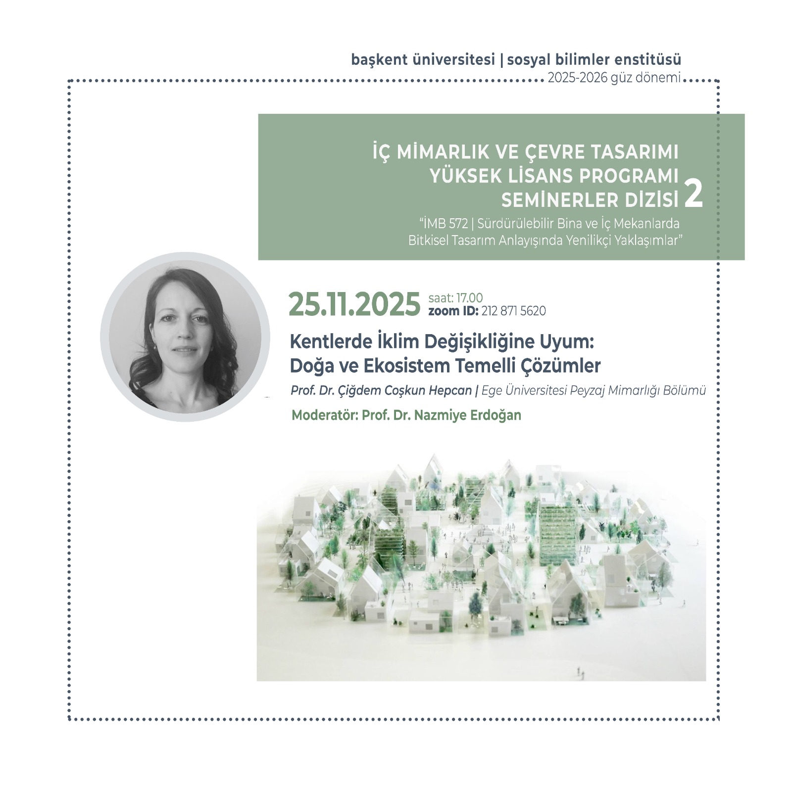 İMB572 Sürdürülebilir Bina ve İç Mekanlarda Bitkisel Tasarım Anlayışında Yenilikçi Yaklaşımlar Yüksek Lisans dersim kapsamında, Ege Üniversitesi Peyzaj Mimarlığı Bölümü Öğretim Üyesi Prof. Dr. Çiğdem COŞKUN HEPCAN ile “Kentlerde İklim Değişikliğine Uyum: Doğa ve Ekosistem Temelli Çözümler” konusunu değerlendirdik.