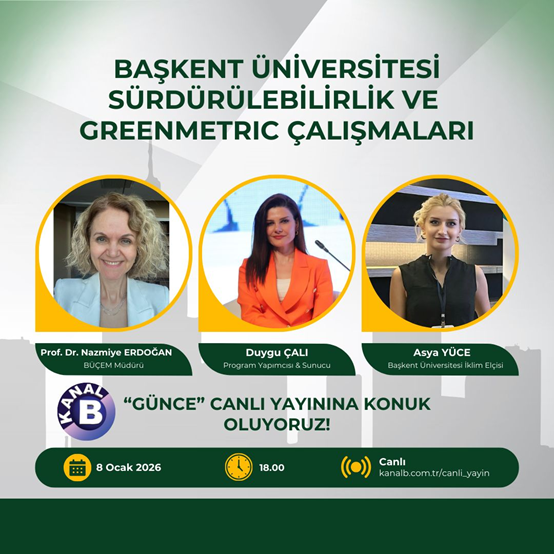8 Ocak 2026 tarihinde, Başkent Üniversitesi Sürdürülebilir Çevre Uygulama ve Araştırma Merkezi (BÜÇEM) Müdürü ve Topluluk danışmanımız Prof. Dr. Nazmiye Erdoğan ile Başkent Üniversitesi İklim Elçisi ve Yönetim Kurulu Başkanımız Asya Yüce, Duygu Çalı’nın sunumuyla Kanal B’de yayınlanan “Günce” programına konuk oldular.